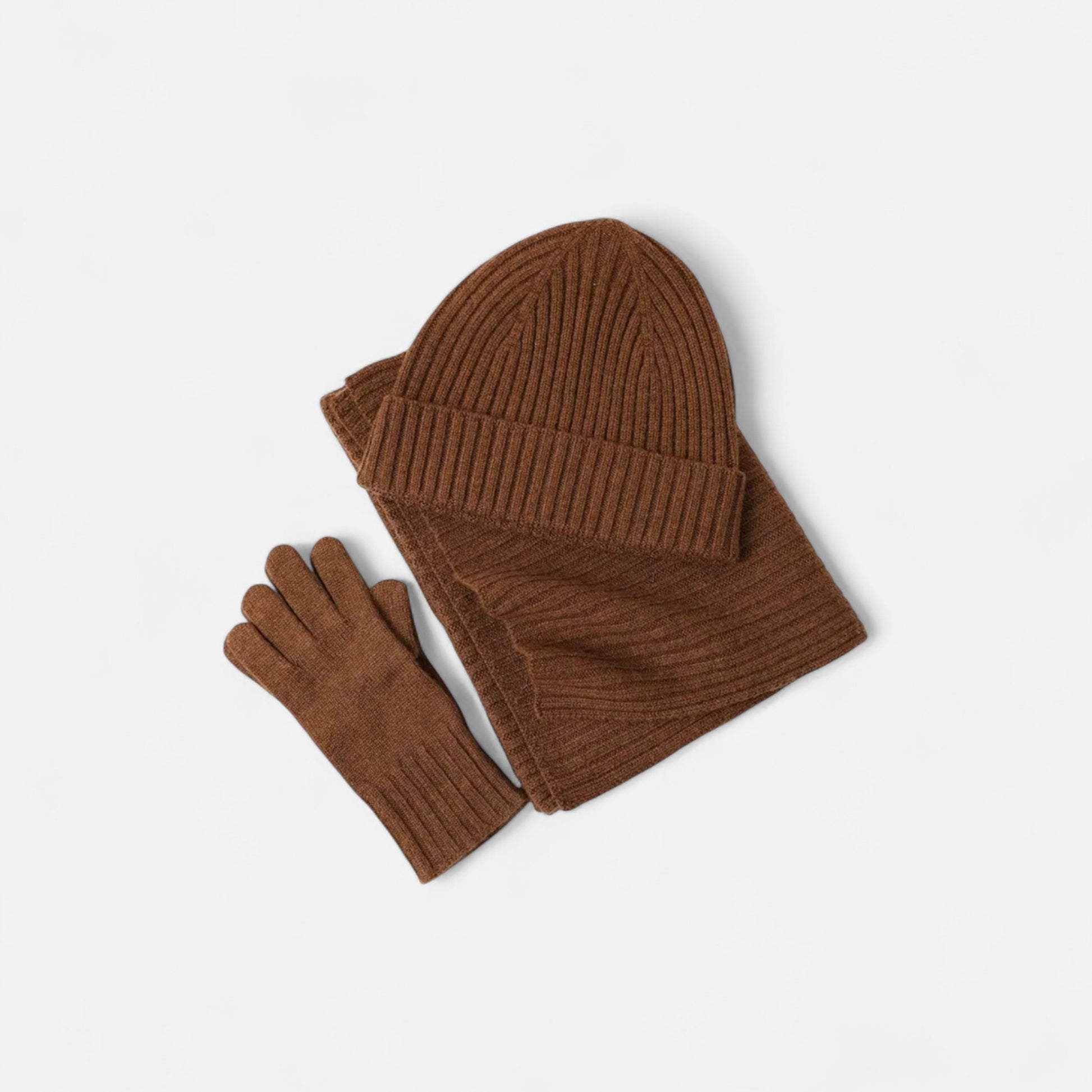 • Three-piece set: scarf, hat, and gloves for complete winter styling